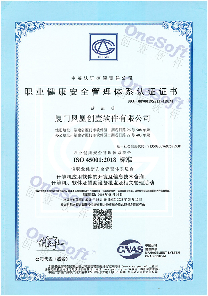 職業(yè)健康安全管理體系認(rèn)證證書-ISO45001