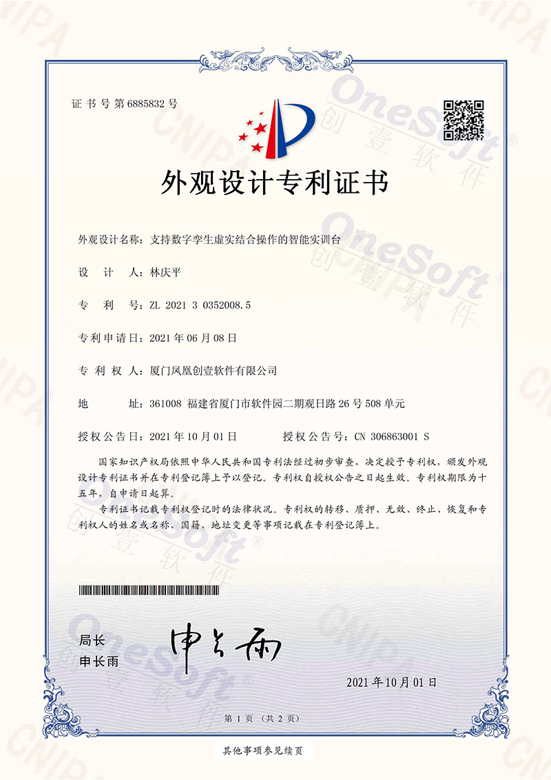 鳳凰創(chuàng)壹智能實(shí)驗(yàn)臺(tái) (外觀設(shè)計(jì)專利證書)