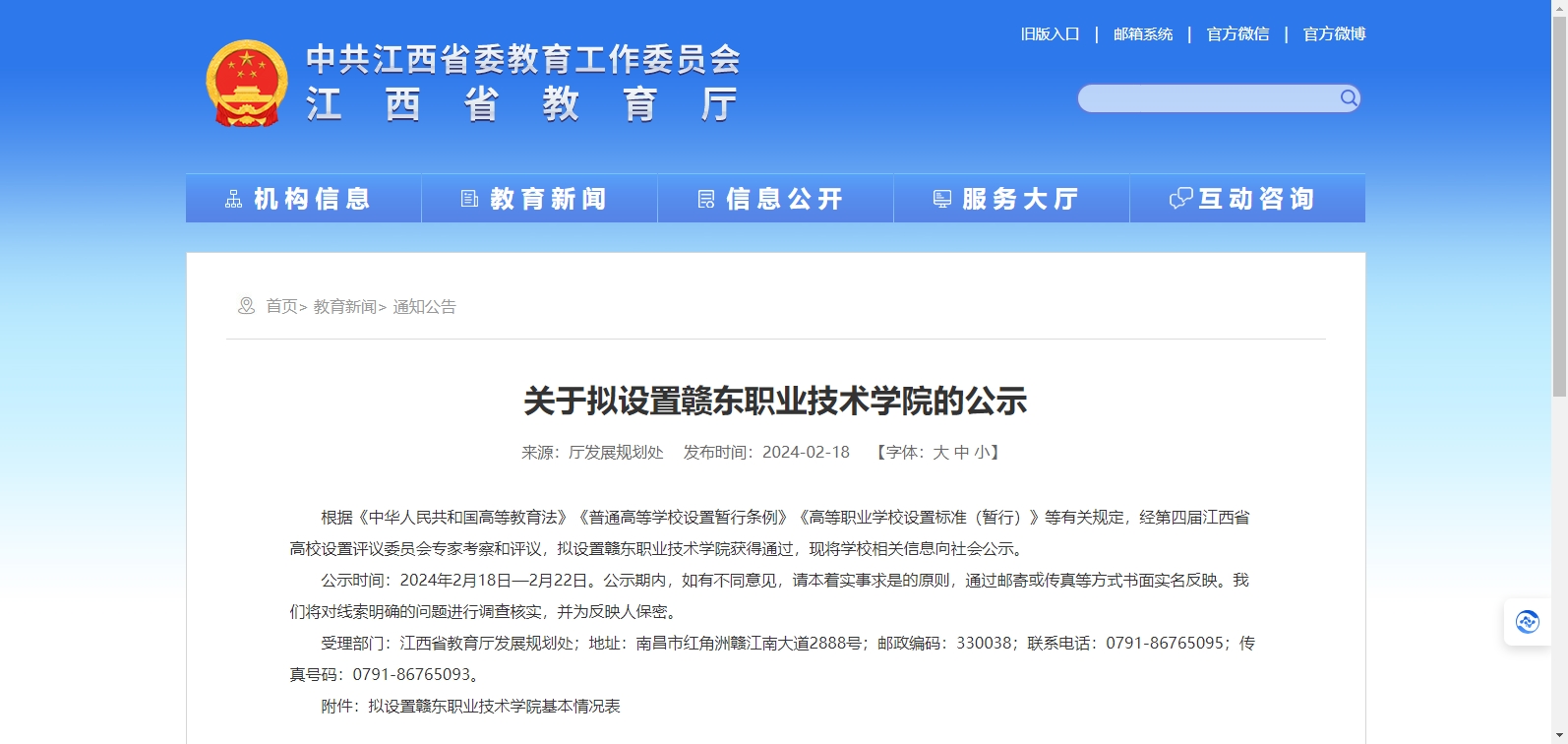 根據(jù)《中華人民共和國高等教育法》《普通高等學校設(shè)置暫行條例》《高等職業(yè)學校設(shè)置標準(暫行)》等有關(guān)規(guī)定,經(jīng)第四屆江西省高校設(shè)置評議委員會專家考察和評議,擬設(shè)置贛東職業(yè)技術(shù)學院獲得通過,現(xiàn)將學校相關(guān)信息向社會公示。