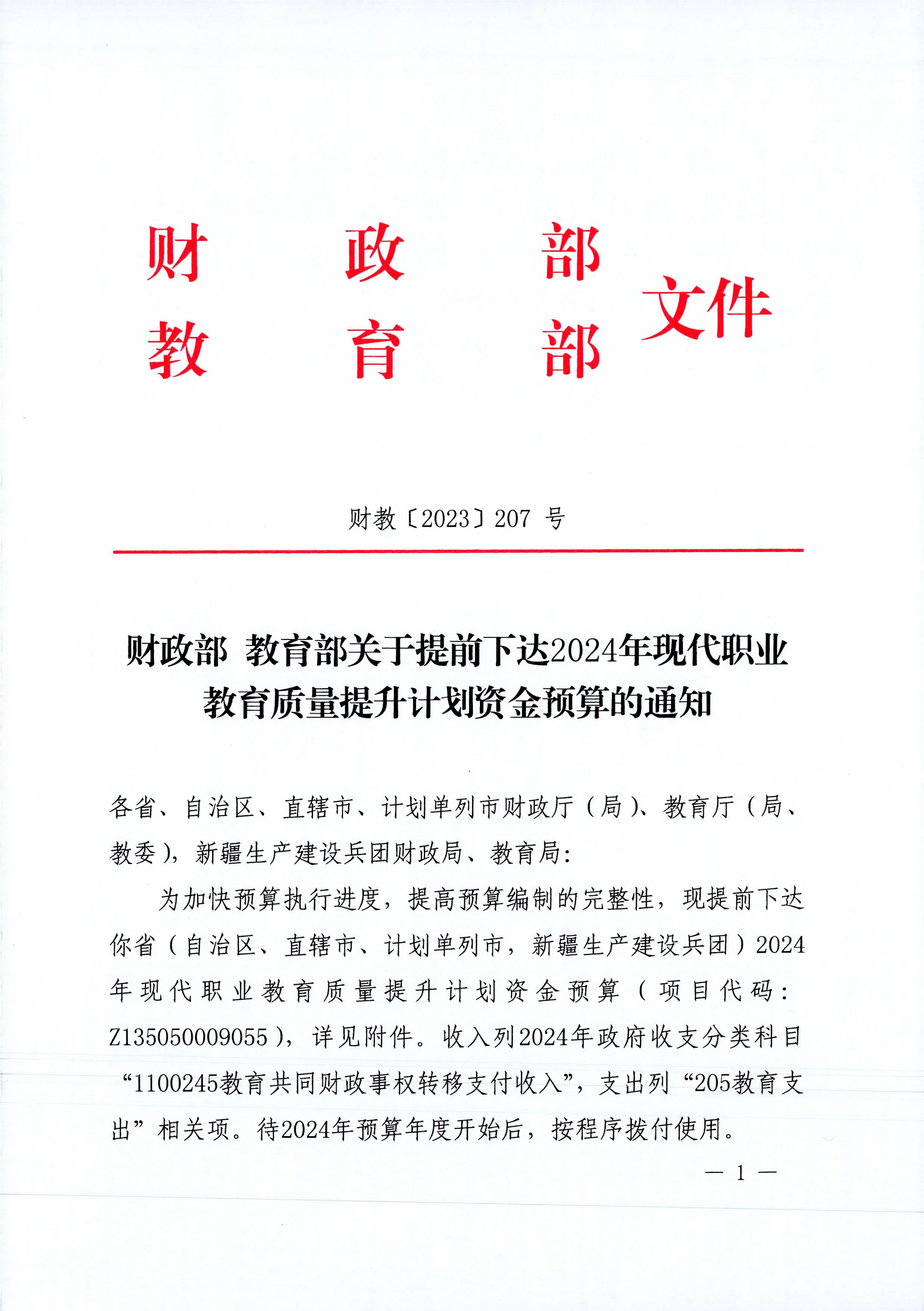 近日,財政部、教育部發(fā)布《提前下達(dá)2024年現(xiàn)代職業(yè)教育質(zhì)量提升計劃資金預(yù)算的通知》