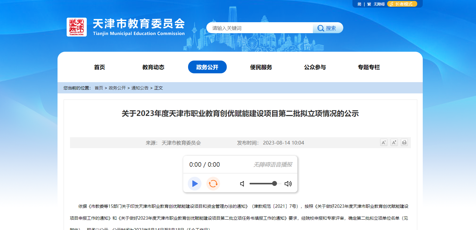 8月14日,天津市教育委員會在其官網(wǎng)發(fā)布《關(guān)于2023年度天津市職業(yè)教育創(chuàng)優(yōu)賦能建設(shè)項目第二批擬立項情況的公示》,依據(jù)《市教委等15部門關(guān)于印發(fā)天津市職業(yè)教育創(chuàng)優(yōu)賦能建設(shè)項目和資金管理辦法的通知》(津......