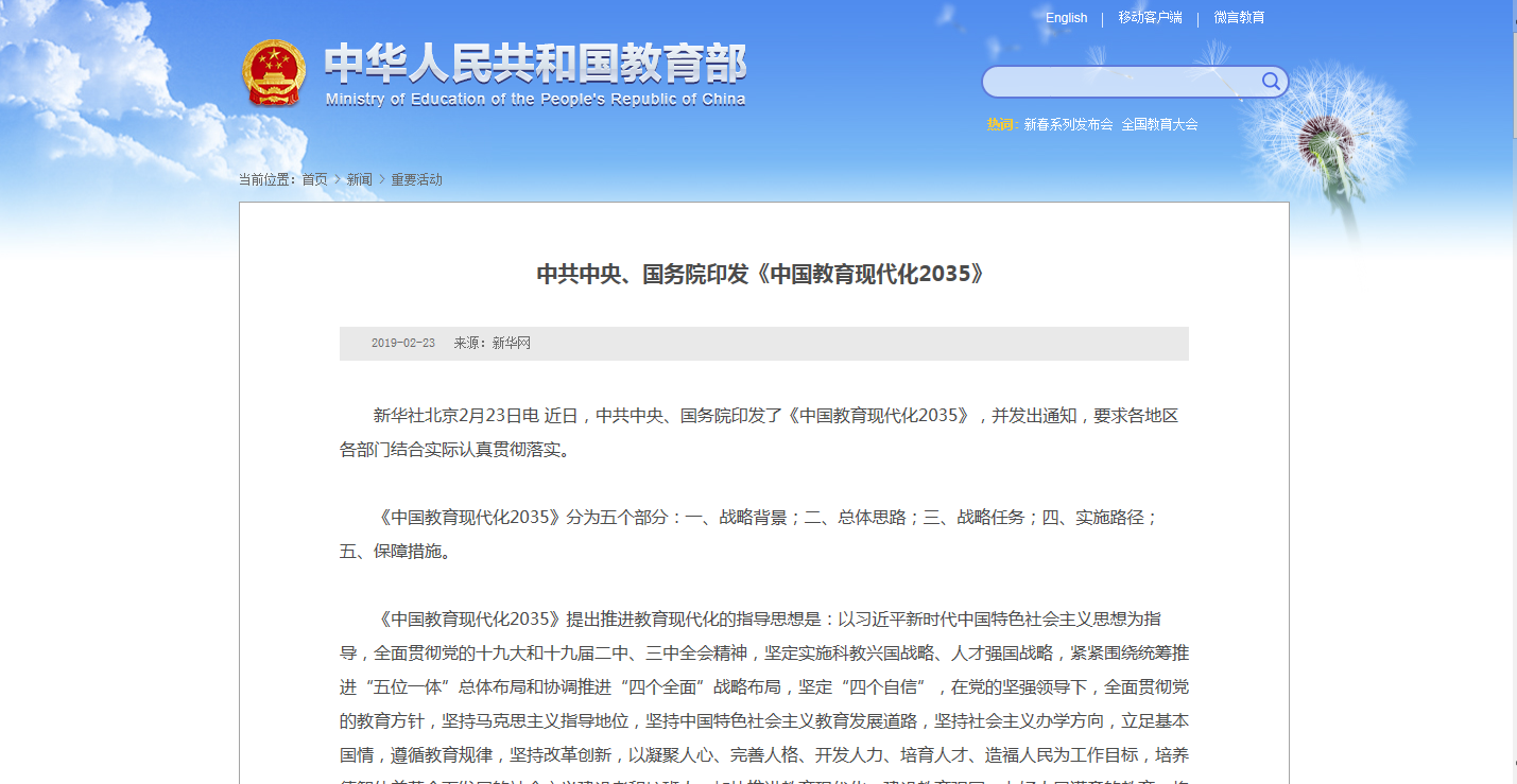 近日,中共中央、國務院印發(fā)了《中國教育現(xiàn)代化2035》,其中提到2035年主要發(fā)展目標是:建成服務全民終身學習的現(xiàn)代教育體系、普及有質量的學前教育、實現(xiàn)優(yōu)質均衡的義務教育、全面普及高中階段教育、職業(yè)教......
