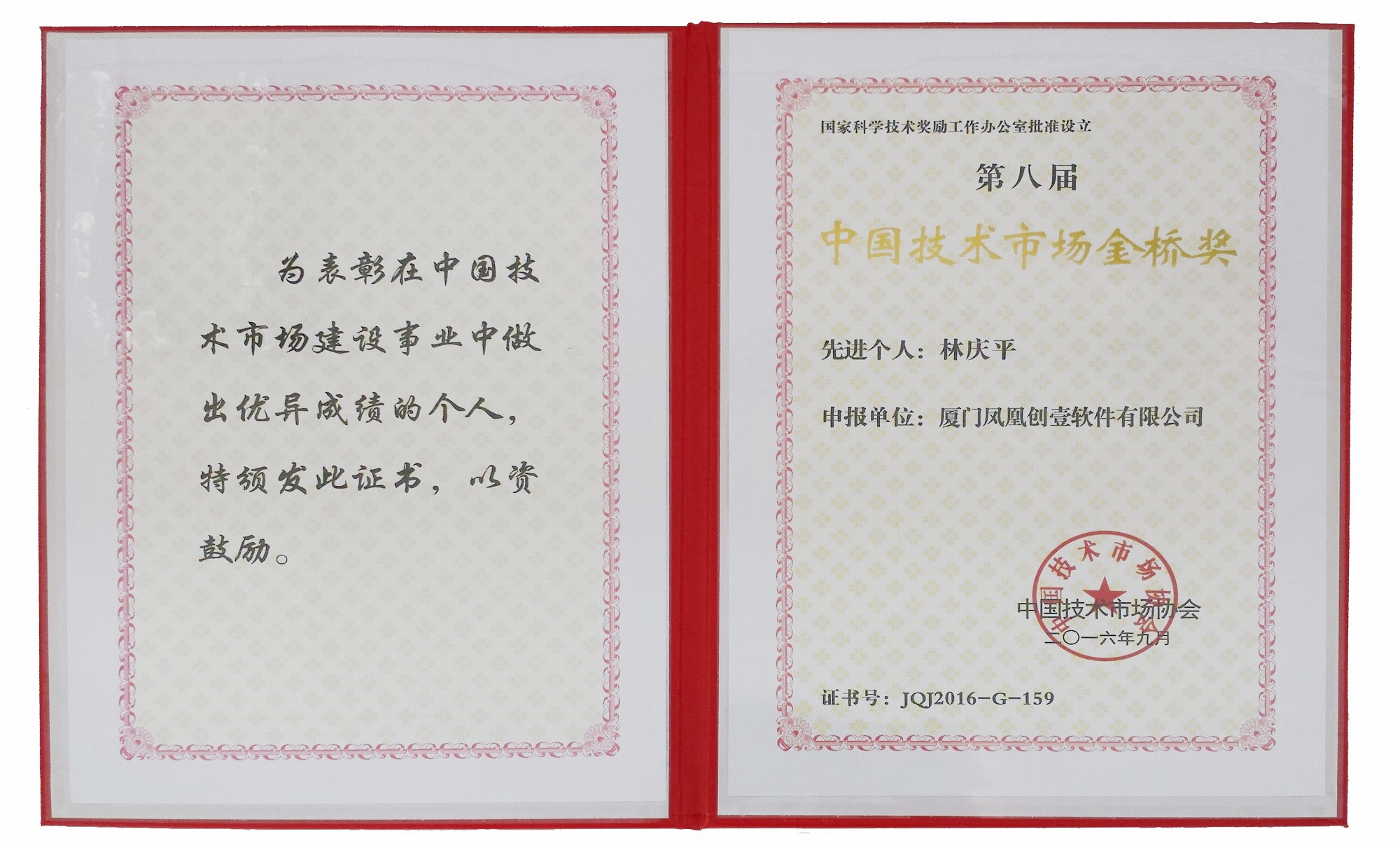日前,中國(guó)技術(shù)市場(chǎng)協(xié)會(huì)公布了“第八屆中國(guó)技術(shù)市場(chǎng)金橋獎(jiǎng)”獲獎(jiǎng)名單,本司(廈門鳳凰創(chuàng)壹軟件有限公司www.wanjinyou168.com)總經(jīng)理兼技術(shù)總監(jiān)林慶平博士榮膺“第八屆中國(guó)技術(shù)市場(chǎng)金橋獎(jiǎng)金橋獎(jiǎng)......