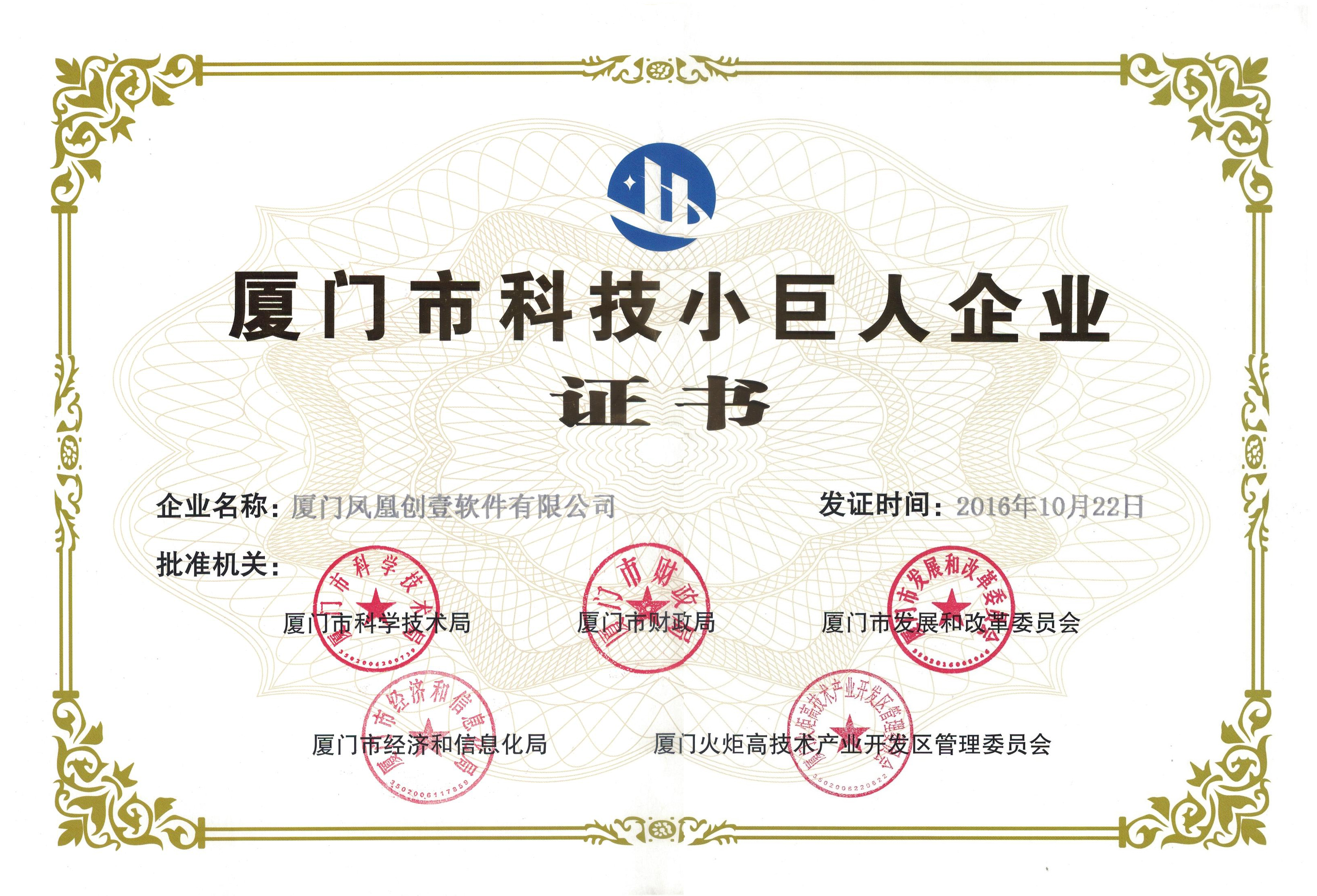 近日,市科技局、財(cái)政局、發(fā)改委、經(jīng)信局和火炬管委會(huì)五部門聯(lián)合公布了2016年廈門市科技小巨人企業(yè)和領(lǐng)軍企業(yè)名單。今年共有346家企業(yè)入選“廈門市科技小巨人企業(yè)庫(kù)”,本公司(廈門鳳凰創(chuàng)壹軟件有限公司......