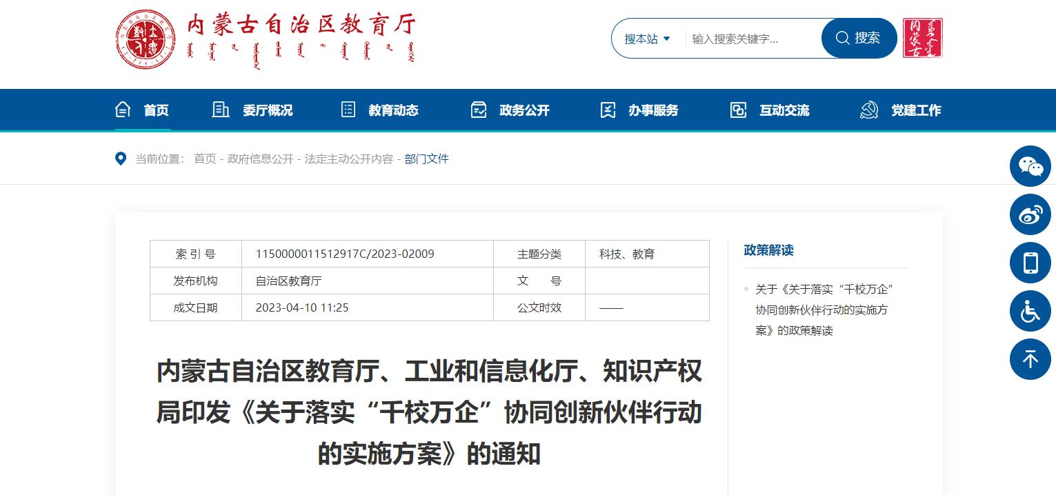 內(nèi)蒙古自治區(qū)教育廳等3部門聯(lián)合印發(fā)《關(guān)于落實(shí)“千校萬(wàn)企”協(xié)同創(chuàng)新伙伴行動(dòng)的實(shí)施方案》