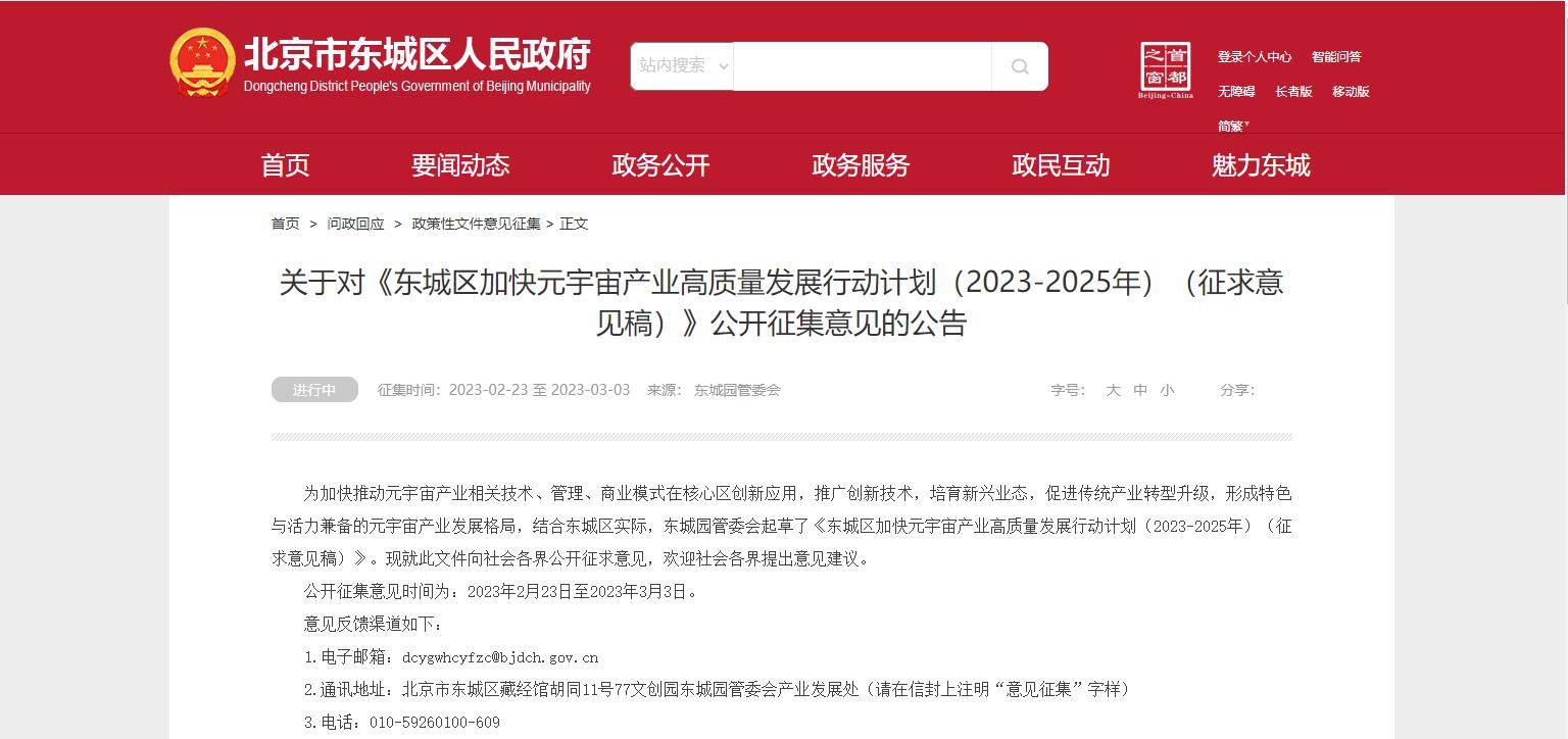 北京市東城區(qū)發(fā)布《東城區(qū)加快元宇宙產(chǎn)業(yè)高質(zhì)量發(fā)展行動計劃(2023-2025年)(征求意見稿)