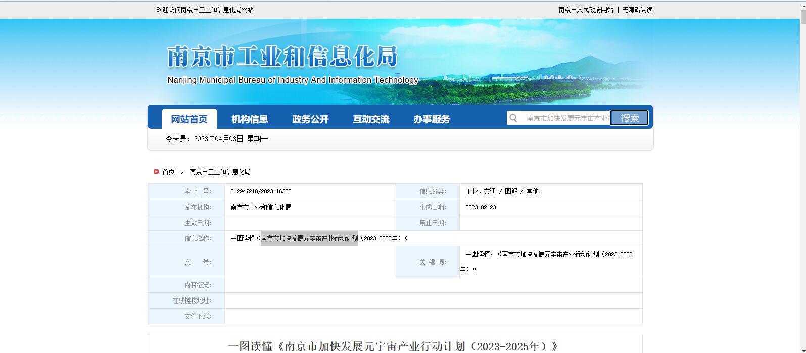 南京市工業(yè)和信息化局發(fā)布《南京市加快發(fā)展元宇宙產(chǎn)業(yè)行動計劃(2023-2025年)》
