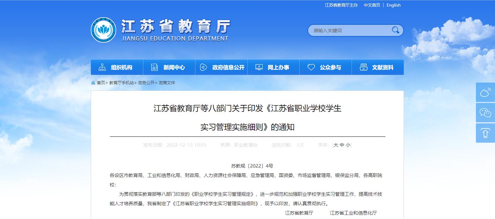 江蘇省教育廳等八部門(mén)日前聯(lián)合印發(fā)《江蘇省職業(yè)學(xué)校學(xué)生實(shí)習(xí)管理實(shí)施細(xì)則》